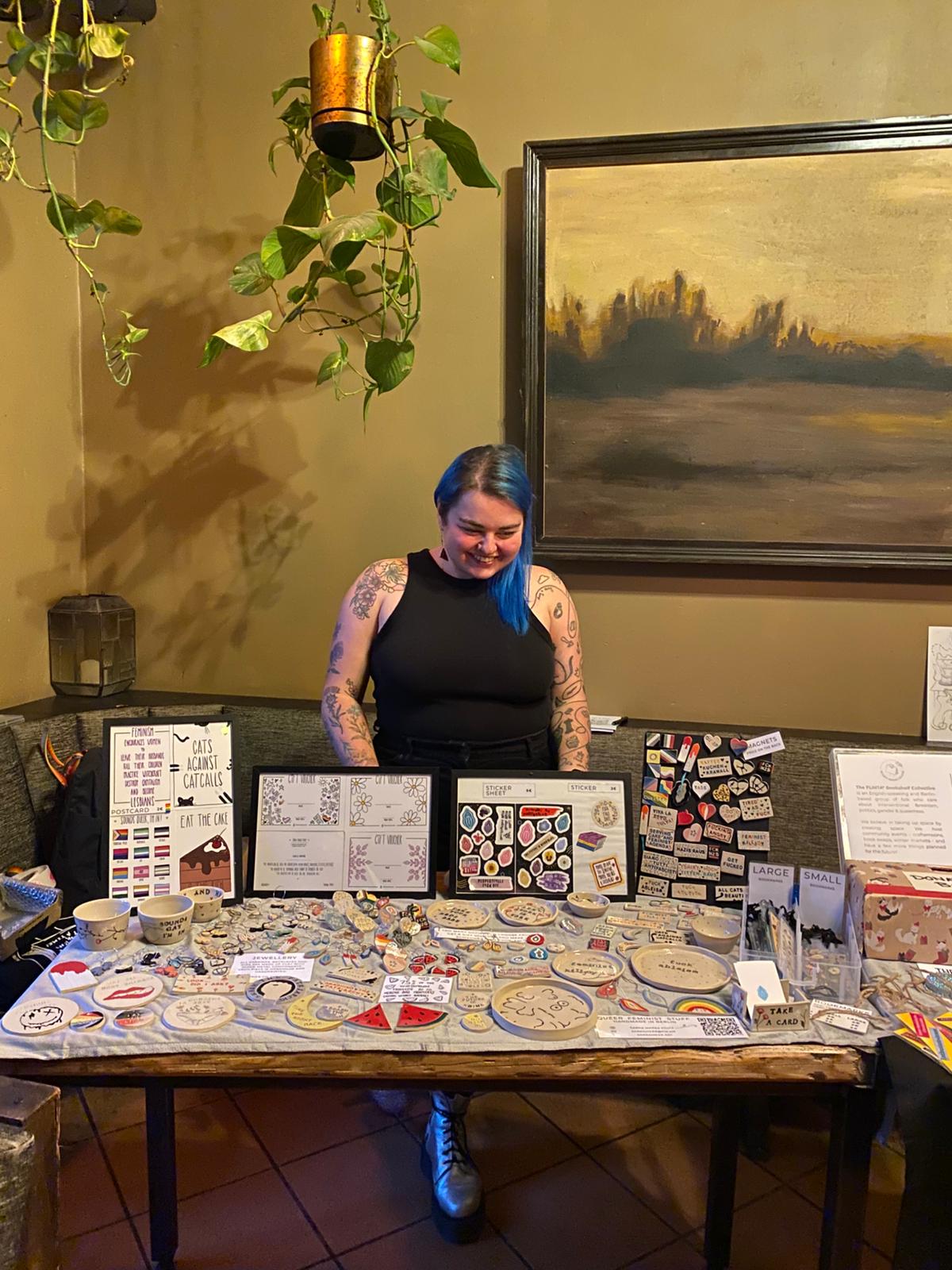Art helps Šárka with navigating her anxiety and creating makes her genuinely happy. She makes stuff that she would enjoy having at home, but her mum doesn’t always approve of. It’s cheeky, saucy, snarky; it’s unapologetically feminist and queer. From cute bookmarks with pressed flowers picked all around Berlin to ceramic plates, mugs, coasters with clits and boobs, pronouns pins, tampon candlesticks, and vulva necklaces, you will always have a good conversation starter.